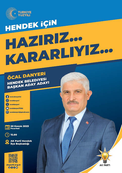 Aday Adaylığı ile ilgili Basın mensuplarına açıklama yapan Danyeri, 1991 yılında asaleten başladığım Öğretmenlik görevim tabiî ki benim ekmek teknem. Yıllardır Öğretmen, İdareci, Şube Müdürü ve Okul Müdürü olarak bugüne kadar 30 yılı aşkın bir süredir edindiğim tecrübelerden dolayı Hendek’imize daha fazla nasıl kazandırabilirim ve hizmet edebilirim düşüncesi ile Belediye Başkan Aday Adayı olarak müracaat etmem halinde daha fazla hizmet etme imkanı bulabilirim diye düşündüm. Ak Parti Hendek Belediye Başkan Aday Adayı olarak Pazartesi (yarın) Ak Parti Hendek İlçe Teşkilatına giderek müracatımı yapacağım diye konuştu.