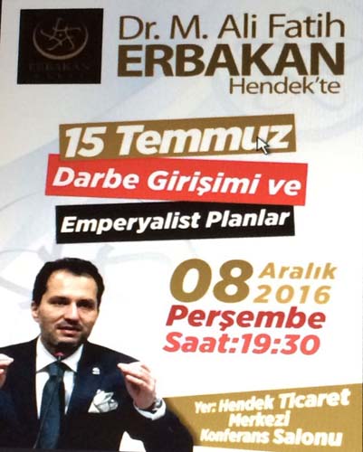 Erbakan vakfı Hendek temsilciliğinin düzenlediği program08 Aralık Perşembe günü saat 19:30’da Hendek Ticaret merkezi konferans salonunda Dr. M. Ali Fatih Erbakan’ın 15 Temmuz Darbe girişimi ve Emperyalist planları konulu konferansına tüm Hendek halkı davet edildi.