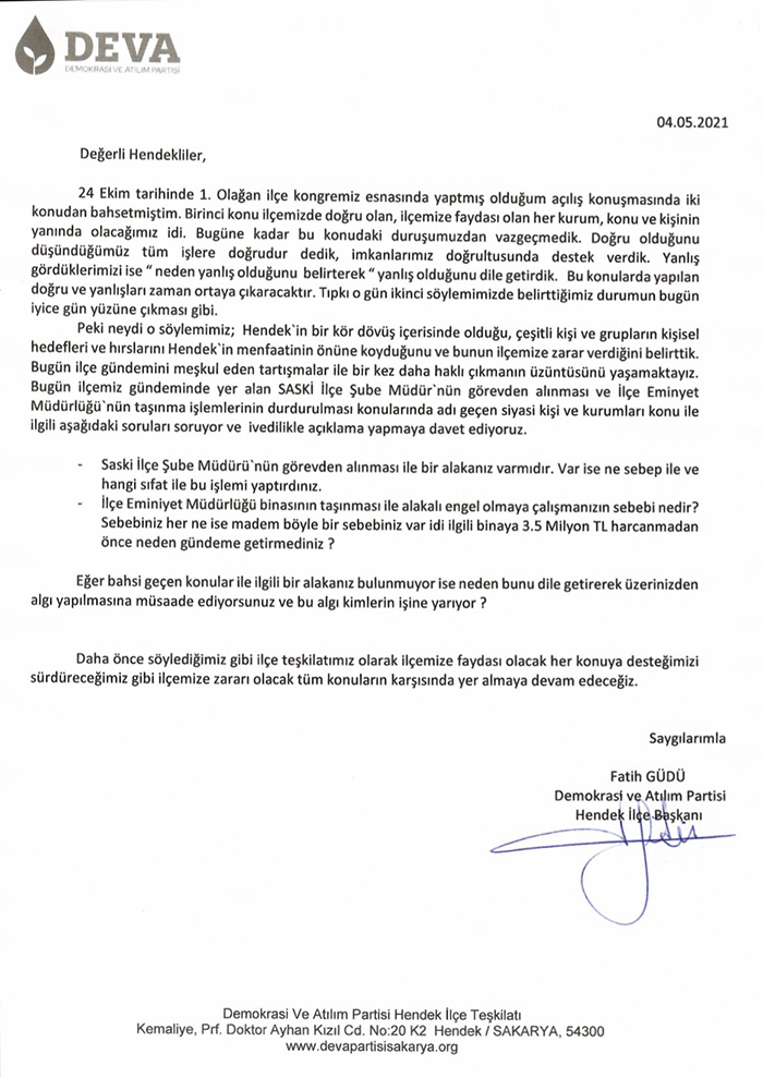 Peki neydi o söylemimiz; Hendek`in bir kör dövüş içerisinde olduğu, çeşitli kişi ve grupların kişisel hedefleri ve hırslarını Hendek`in menfaatinin önüne koyduğunu ve bunun ilçemize zarar verdiğini belirttik. Bugün ilçe gündemini meşgul eden tartışmalar ile bir kez daha haklı çıkmanın üzüntüsünü yaşamaktayız.