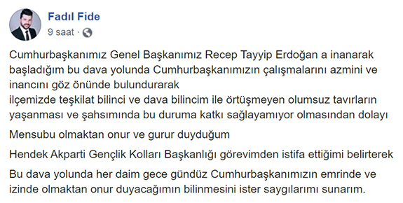 Kendisine ait sosyal medya hesabında yaptığı paylaşımda bulunan Fide, “Cumhurbaşkanımız Genel Başkanımız Recep Tayyip Erdoğan’a inanarak başladığım bu dava yolunda Cumhurbaşkanımızın çalışmalarını azmini ve inancını göz önünde bulundurarak İlçemizde teşkilat bilinci ve dava bilincim ile örtüşmeyen olumsuz tavırların yaşanması ve şahsımın da bu duruma katkı sağlayamıyor olmasından dolayı mensubu olmaktan onur ve gurur duyduğum Hendek Ak Parti Gençlik Kolları Başkanlığı görevimden istifa ettiğimi belirterek bu dava yolunda her daim gece gündüz Cumhurbaşkanımızın emrinde ve izinde olmaktan onur duyacağımın bilinmesini ister saygılarımı sunarım” ifadeleri ile görevinden istifa ettiğini duyurdu.