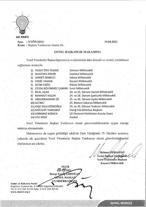 Ak Parti Genel Başkanı ve Cumhurbaşkanı Recep Tayyip Erdoğan’ın tensipleri ile yeni dönemde görev alacak Yerel Yönetimler Başkan Yardımcılığına 14 kişi görevlendirildi.