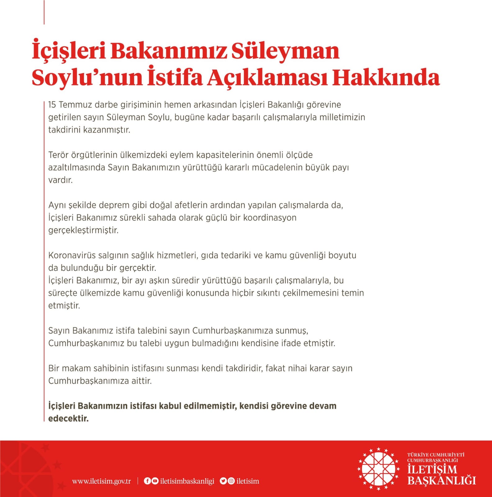 İçişleri Bakanımız Sayın Süleyman Soylu’nun istifa açıklaması hakkında Cumhurbaşkanlığı İletişim Başkanlığı açıklaması.