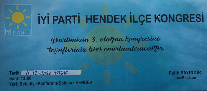 İyi Parti Hendek İlçe Teşkilatı 3. Olağan Kongresi 11 Aralık Pazar günü (Yarın) Saat: 13.00’da Hendek Belediyesi Nikah, Toplantı ve Konferans Salonunda yapılacak.