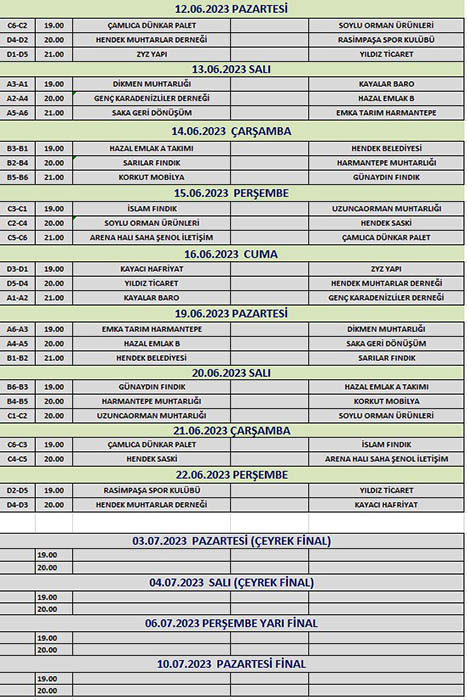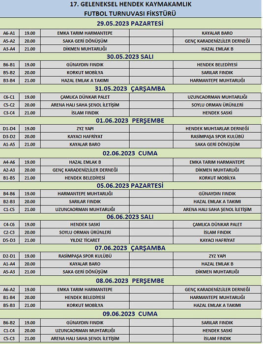 Hendek Kaymakamlığı tarafından geleneksel hale getirilen futbol turnuvasının bu yıl 17.’sinin gerçekleştirileceği öğrenilirken, turnuva tertip komitesi ve takım temsilcileri tarafından Turnuva Fikstürü 24 Mayıs 2023 Saat: 16.00’da Hendek İlçe Milli Eğitim Müdürlüğü toplantı salonunda yapılan kura sonucunda şekillendi.