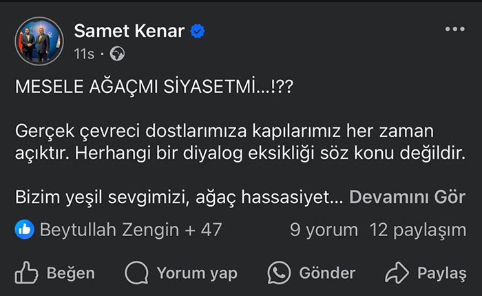 Hendek Rasimpaşa Camii karşısındaki alanda gerçekleştirilen ağaç kesimleri sonrası Siyasiler ve Vatandaşlar tarafından yapılan paylaşımlar ve tepkiler sonrası BBP Hendek İlçe Başkanı Samet Kenar “Mesele Ağaç mı Siyaset mi?” diyerek Ak Parti Hendek Belediye Meclis Üyesi Ali Kemal Sofu’ya yüklendi.