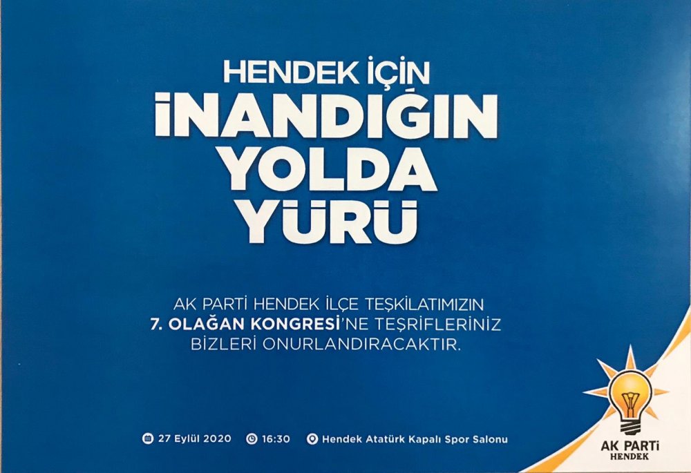 Ak Parti Hendek İlçe Teşkilatı sosyal medya hesabından yapılan paylaşımda “Hendek İlçe Kongremiz 27.09.2020 saat 16.30’da Hendek Atatürk Kapalı Spor Salonun da gerçekleştirilecektir” ifadelerine yer verildi.