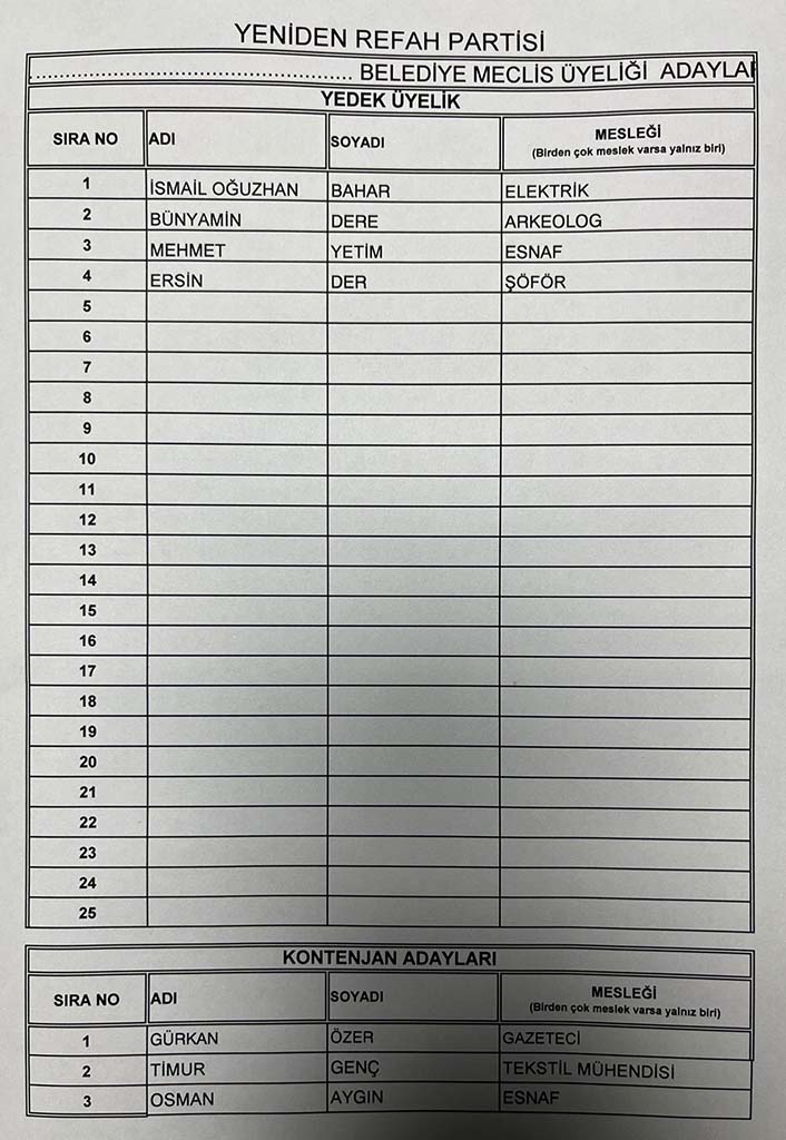 Hendek Belediyesi Yeniden Refah Partisi Meclis Adaylarının isimleri;