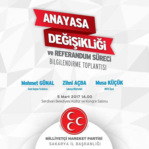 Babaoğlu toplantıda ayrıca “MHP Sakarya İl Teşkilatımızın 5 Mart Pazar günü saat 14:00 de Serdivan Belediyesi Kültür ve Kongre Salonunda yapacağı "Referandum Süreci Bilgilendirme Toplantısına” gelmek isteyen herkes davet etti.