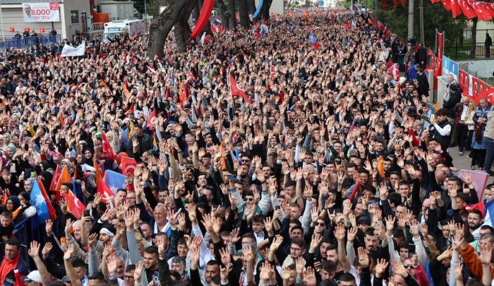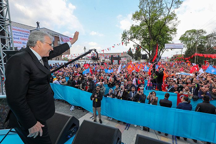 On binlerce Sakaryalı vatandaşın büyük bir coşkuyla karşıladığı Cumhurbaşkanı Erdoğan, meydanları, yolları dolduran Sakaryalıları görünce duygulandığını ifade ederek, bu tablonun Sakarya’nın, Akyazı’nın 14 Mayıs’a hazır olduğunu belirtti. 7’li masaya Akyazılıların, Sakaryalıların gerekli dersi vereceğini dile getiren Erdoğan, “Sakarya, saf çocuğu masum Anadolu'nun, divanesi ikimiz kaldık Allah yolunun. Ben Sakarya'nın bu dersi vereceğine inanıyorum. Milli mücadele ruhunu hiçbir zaman kaybetmedik, kaybetmeyeceğiz. 21 sene değil 40 yıl dik durduk, dikleşmedik, bu millete efendi olmaya değil hizmetkâr olmaya geldik. Bizim kendi hikâyemiz vatanımızı sevmekle başladı” diye konuştu.