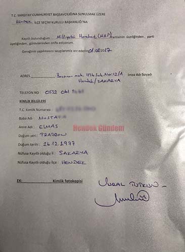 MHP Meclis Üyesi Vural Tutkun MHP Parti üyeliğinden istifa ettiğini belirten dilekçesini İlçe Teşkilatına gönderdiğini belirtti.