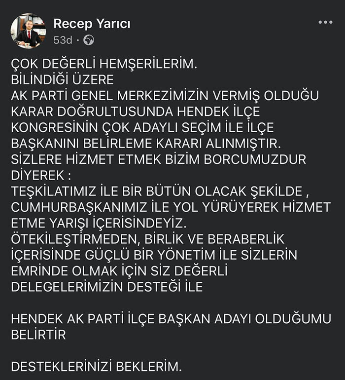 Önceki dönem Hendek Belediye Meclis Üyesi İşadamı Recep Yarıcı, Ak Parti Hendek 8. Olağan İlçe Kongresinde Aday olduğunu açıkladı.