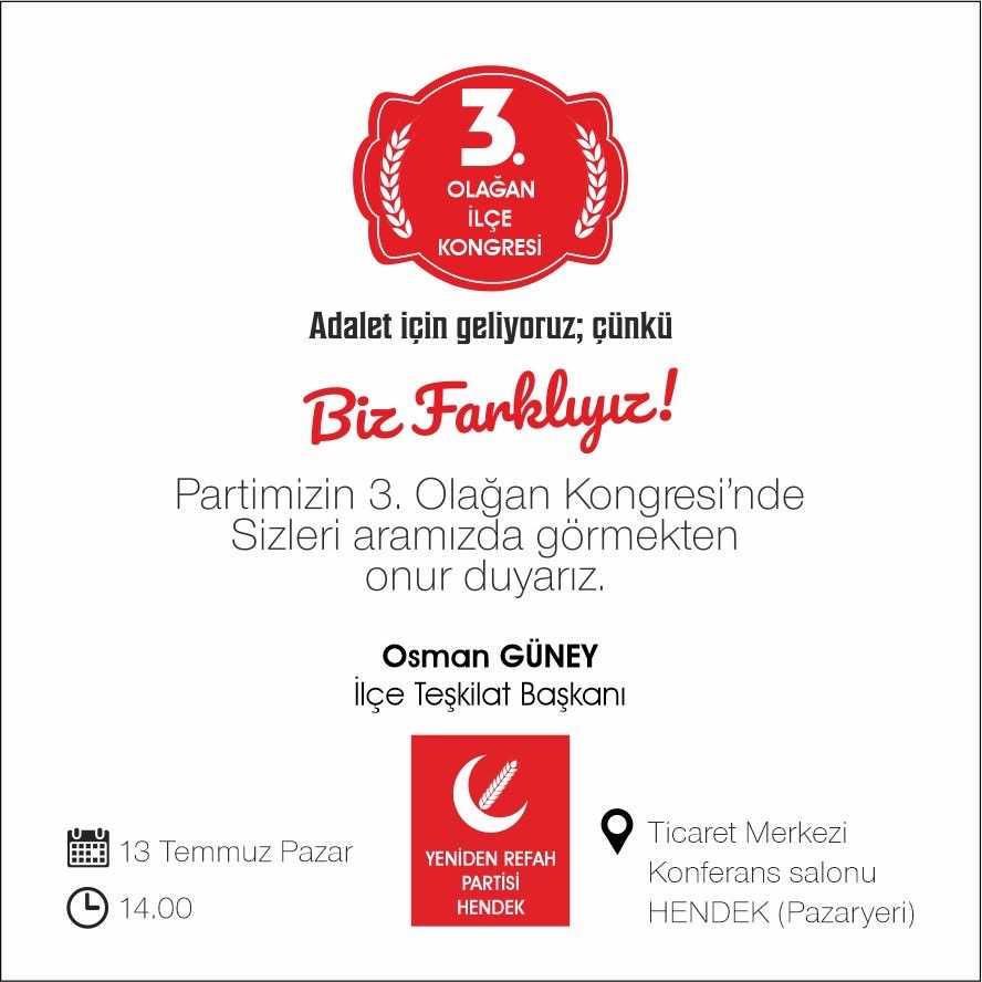 Yeniden Refah Partisi Hendek İlçe Teşkilatı “Adalet için geliyoruz; çünkü Biz Farklıyız” sloganı ile 13 Temmuz’da 3. Kongresini gerçekleştirecek.