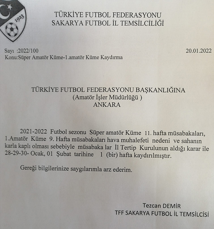 Futbol Federasyonu Sakarya Futbol İl Temsilciliği’nden yapılan açıklamada 2021-2022 Futbol sezonu Süper amatör 11.Hafta müsabakaları, 1.Amatör Küme 9.Hafta müsabakaları Hava muhalefeti nedeni ve sahanın karla kaplı olması sebebiyle müsabakalar İl tetip komitesinin aldığı karar ile 28-29-30 Ocak 01 Şubat Tarihine 1(1)Hafta Kaydırılmıştır. İfadesi kullanıldı