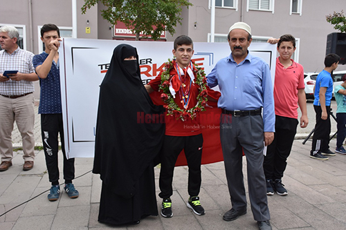 Kaymakam Orhan Burhan da konuşmasında “ Sporda başarılar elde etmek kolay değildir. Sporun pek çok dallarından biri olan güreş ve karate gibi belirli spor dallarında ilçemiz çok iyi durumdadır. Dünya ve Avrupa Şampiyonalarında sıralamaya giren ülke durumundayız. Bunlar bizim için uzak hedeflerdi, çalıştıkça hedeflerimize ulaşıp mutlu oluyoruz. Dünya’da medeniyet, çağdaşlık sıralamaları, bu tür spor dallarında kazanılan başarılarla ölçülüyor. Bu başarılarla, Ülkemizin adını tüm Dünya’ya duyuruyor, bayrağımızı dalgalandırıyor ve İstiklal Marşımızı milyonlarca insanın evlerinde izlediği televizyonlardan dinlettirme şansını buluyoruz. Çocuklarımızın başarısında emeği geçen, vekilimizi, belediye başkanımızı, ailelerini ve hocalarımızı tebrik ediyorum “ dedi. Programın sonunda genç sporcuyu altınla ödüllendirdiler.
