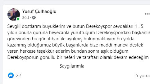Yusuf Çulhaoğlu sosyal medyadan yaptığı açıklamada, Sevgili dostlarım büyüklerim Dereköy sevdalıları 1.5 yıldır onurla gururla yürüttüğüm Dereköyspor’daki başkanlık görevimden bu gün itibarıyla ayrılmış bulunmaktayım bu yolda kazanmış olduğumuz büyük başarılarda bize maddi manevi destek veren herkese teşekkür ederim.