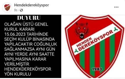Hendek Dereköysopor sosyal medya sayfasından yaptığı paylaşımda ‘’Olan üstü genel kurul kararı 15-06-2023 Tarihinde seçim kulüp binasında yapılacaktır.