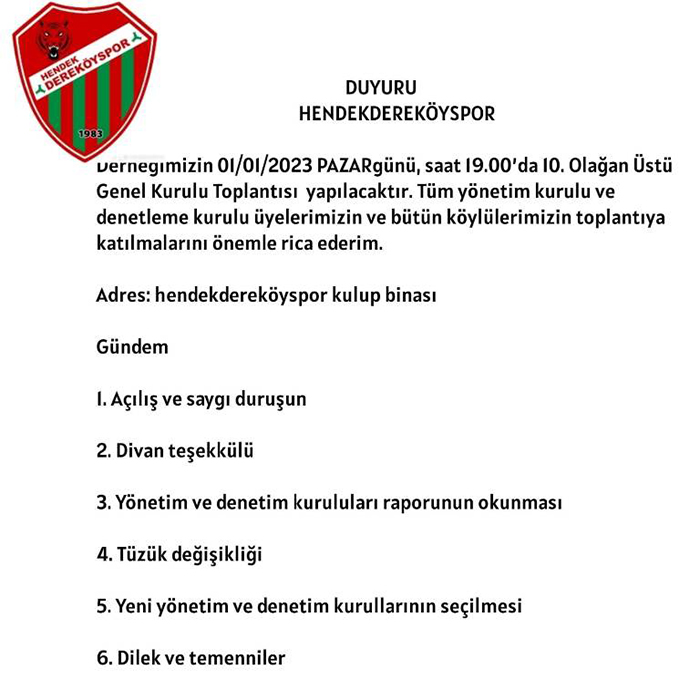 Dereköyspor Yönetiminden yapılan açıklamada; Derneğimizin 01.01.2023 Pazar günü Saat: 19.00'da 10. Olağan Üstü Genel Kurul Toplantısı yapılacaktır. Tüm Yönetim Kurulu, Denetleme Kurulu Üyelerimiz ve bütün Köylülerimizin toplantıya katılmalarını rica ederim.