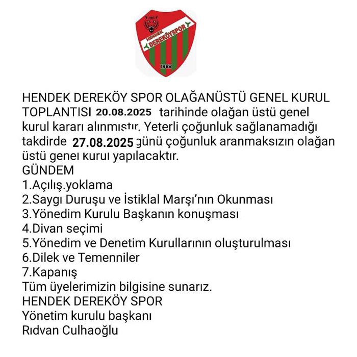 Hendek Dereköyspor 20 Ağustos 2025 Çarşamba günü Olağanüstü genel kurul düzenleyecek.