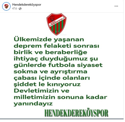 Hendek Dereköyspor sosyal medyasından yayınladığı kınama mesajında, Ülkemizde yaşanan deprem felaketi sonrası birlik ve beraberliğe ihtiyaç duyduğumuz şu günlerde futbola siyaset sokma ve ayrıştırma çabası içinde olanları şiddetle kınıyoruz.