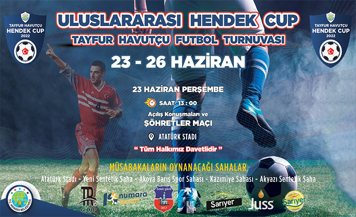 Uluslararası Hendek Cup Tayfur Havutçu Futbol Turnuvası 23 Haziran tarihinde saat 14.00’da Hendek Atatürk Stadyumunda ünlü futbolcuların katılımıyla şöhretler maçı ile başlayacak. Turnuvada Hendek Atatürk Stadyumu, Hendek Yeni Sentetik Saha, Hendek Akova Barış Spor Sahası, Hendek Kazımiye Sahası ve Akyazı da bulunan Sentetik Saha kullanılacak. Ünlü futbolcular ile Hendek Karması’nın mücadele edeceği maçın ardından saat 15.00’da 5 sahada eş zamanlı maçların başlangıç düdüğü çalacak. Gruplar puan usulü yapılıp maçların sonunda çeyrek final, yarı final ve final müsabakaları oynanacak.