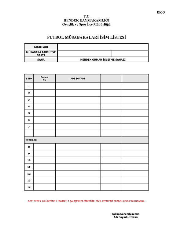 - Takımlar müsabaka başlamadan 10 dk önce ekte ki esame listesini turnuva görevlisine teslim edecektir. Her müsabaka için esame düzenlenecektir. Ek-3