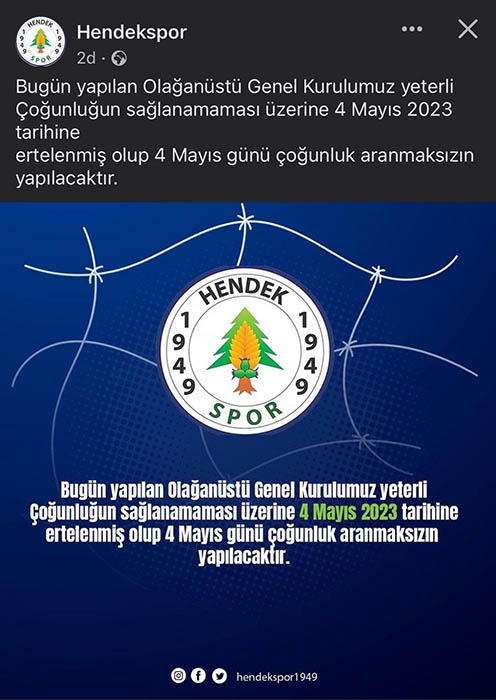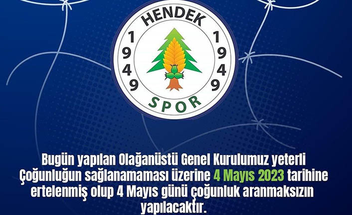 Hendekspor Kulübünden yapılan açıklamada “Bugün yapılan Olağanüstü Genel Kurulumuz yeterli çoğunluğun sağlanamaması üzerine 4 Mayıs 2023 tarihine ertelenmiş olup 4 Mayıs günü çoğunluk aranmaksızın yapılacaktır” ifadelerine yer verildi.
