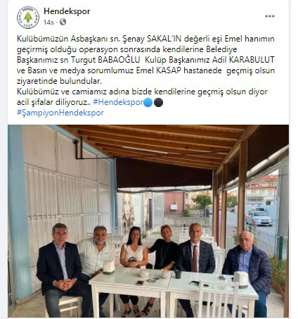 Kulübümüzün Asbaşkanı sn. Şenay SAKAL’IN değerli eşi Emel hanımın geçirmiş olduğu operasyon sonrasında kendilerine Belediye Başkanımız sn Turgut BABAOĞLU Kulüp Başkanımız Adil KARABULUT ve Basın ve medya sorumlumuz Emel KASAP hastanede geçmiş olsun ziyaretinde bulundular.