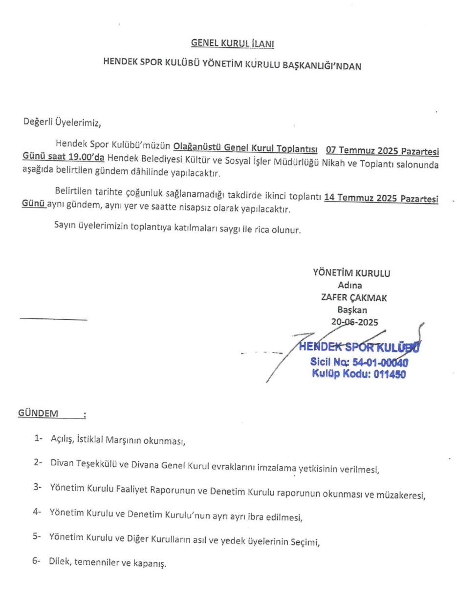 Hendek Spor Kulübü'müzün Olağanüstü Genel Kurul Toplantısı 07 Temmuz 2025 Pazartesi Günü Saat 19.00'da Hendek Belediyesi Kültür ve Sosyal İşler Müdürlüğü Nikah ve Toplantı salonunda aşağıda belirtilen gündem dâhilinde yapılacaktır.