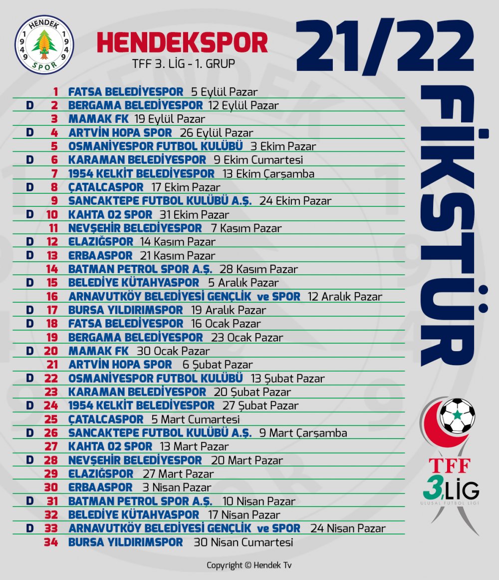 Hendekspor’un 2021-2022 sezonu TFF 3. Lig’de karşılaşacağı rakipleri ve maç tarihleri şu şekilde;