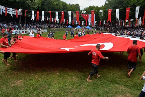 Başpehlivanlar Cumhurbaşkanı Recep Tayyip Erdoğan’ın okuduğu Arif Nihat Asya’nın DUA şiiri ve dev Türk bayrağı ile er meydanına inerek halkı selamlamaları vatandaşlardan büyük alkış alırken coşku doruğa çıktı.
