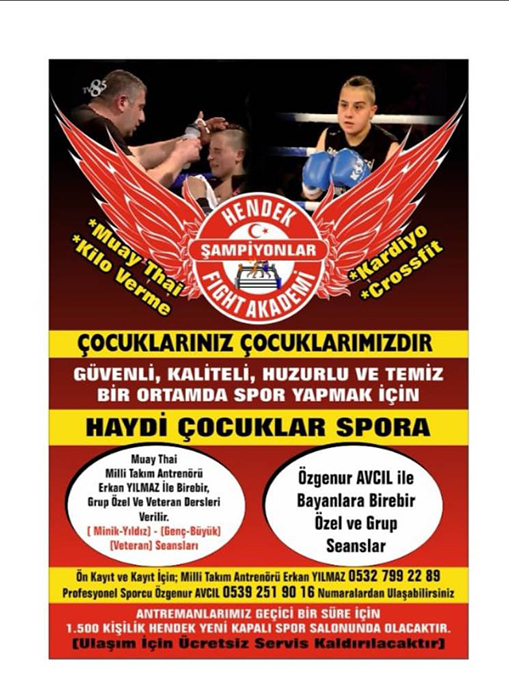 Muay Thai milli takım antrenörü Erkan Yılmaz ( çocuklarınız çocuklarımızdır haydi çocuklar spora) sloganıyla Hendek Şampiyonlar Fıght Akademi adı ile kurduğu Spor Salonu 24 Şubat 2021 Çarşamba günü Hendek yeni kapalı spor salonunda antrenmanlarına başlayacaktır.