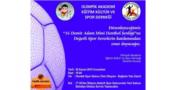 26.11.2016 Cumartesi Günü 18:00'de Hendek Spor Salonunda ( Yeni) yapılacak olan 16 Demir Adam Hentbol Şölenine tüm halkımızı davet ediyoruz.
