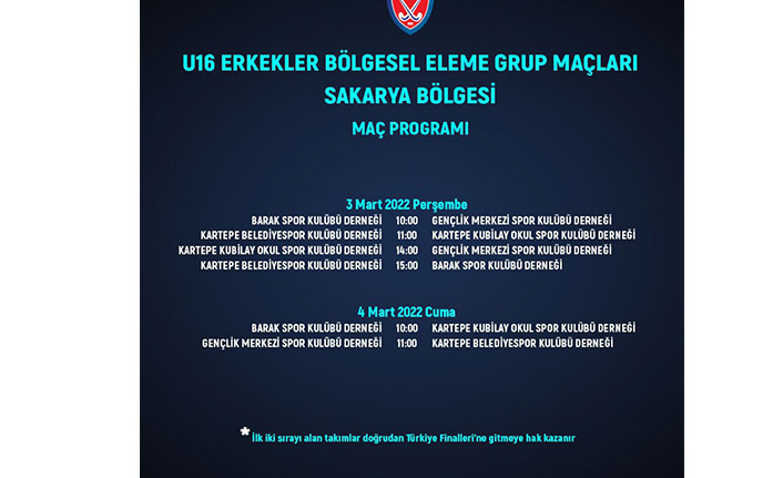 Türkiye Hokey Federasyonu tarafından 3-4 Mart 2022 tarihlerinde Hendek Yeni Spor Salonunda U-16 Salon Hokey Bölgesel Lig müsabakaları yapılacak.