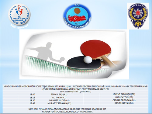 Hendek Emniyet Müdürlüğü ve Gençlik Spor İlçe Müdürlüğünün ortaklaşa düzenlemiş olduğu kurumlar arası masa tenisi turnuvası finalleri 01.04.2015 çarşamba günü saat 18:00'da yeni kapalı spor salonun start alacak.