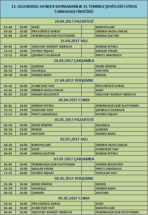 13.Geleneksel Hendek Kaymakamlık 15 Temmuz Şehitleri Futbol Turnuvası, 24 Nisan Pazartesi günü 18.00 de SASKİ ile Karayolları arasında oynanacak maç ile start alacak.