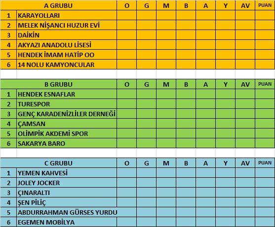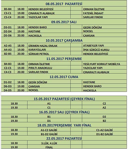 Hendek Orman işletme sahasında oynanacak olan maçlara 4.Grupta 21 takımın mücadele edecek turnuvanın final karşılaşması 22 Mayıs 2017 Saat 19.30 oynanacak.
