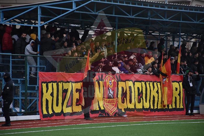 Karasuspor’un başlama vuruşu ile başlayan karşılaşma karşılıklı ataklarla devam etti. Orta saha mücadelesi şeklinde devam eden karşılaşmanın ilk yarısında her iki takım da yakaladığı pozisyonları değerlendiremedi ve ilk yarı 0-0 eşitlik ile sonuçlandı. Karasuspor taraftarlarının Hendekspor yedek kulübesinin olduğu bölüme yönelik küfür, torpil ve su şişeleri ile tacizi ise ilk yarıya damgasını vururken, atılan torpiller ile Hendekspor yedek kulübesinde bir kişi hafif yaralandı.