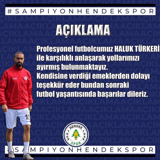 Hendekspor Kulübü Basın birimi tarafından yapılan açıklamada, Profesyonel futbolcumuz Haluk Türkeri ile görüşerek karşılıklı olarak yollarımızı ayırmış bulunmaktayız. Kendisine verdiği emeklerden dolayı Teşekkür eder bundan sonraki futbol hayatında başarılar dileriz ifadelerine yer verildi.