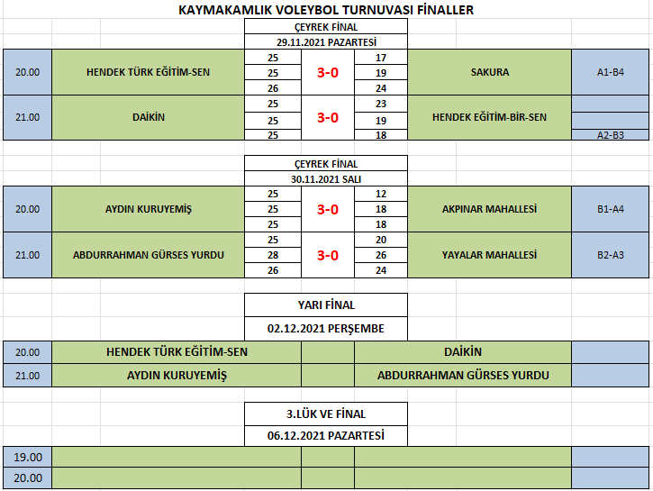 Hendek Kaymakamlık Voleybol Turnuvasında 29-30 Kasım 2021 tarihlerinde oynanan Çeyrek Final müsabakalarında; Hendek Türk Eğitim-Sen rakibi - Sakura Voleybol Takımını 25-17, 25-19, 26-24 setler ile 3-0, Daikin takımı rakibi Eğitim Bir-Sen takımını 25-23, 25-19, 25-18 setler ile müsabakadan 3-0 galip geldi.