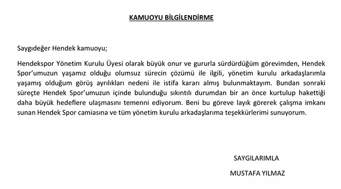 Hendekspor Yönetim Kurulu Üyesi olarak büyük onur ve gururla sürdürdüğüm görevimden, Hendek Spor’umuzun yaşamız olduğu olumsuz sürecin çözümü ile ilgili, yönetim kurulu arkadaşlarımla yaşamış olduğum görüş ayrılıkları nedeni ile istifa kararı almış bulunmaktayım. Bundan sonraki süreçte Hendek Spor’umuzun içinde bulunduğu sıkıntılı durumdan bir an önce kurtulup hakettiği daha büyük hedeflere ulaşmasını temenni ediyorum. Beni bu göreve layık görerek çalışma imkanı sunan Hendek Spor camiasına ve tüm yönetim kurulu arkadaşlarıma teşekkürlerimi sunuyorum” ifadelerine yer verdi.