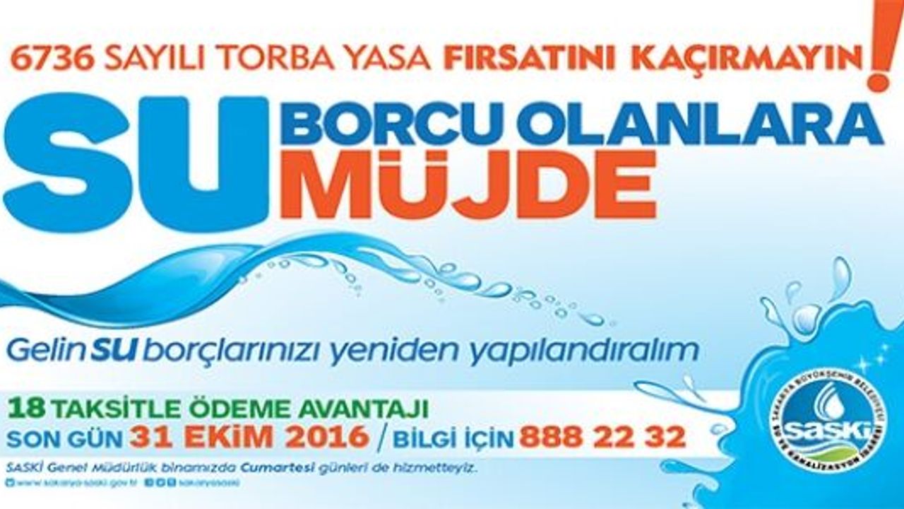 Torba yasanın borçlu vatandaşlar için birçok fırsatı beraberinde getirdiğini de dile getiren SASKİ Genel Müdür Yardımcısı Sebahattin Belik, Yasa ile borçlu vatandaşların ödeme vadesi 30 Haziran 2016 tarihi ve öncesinde birikmiş borçları yeniden yapılandırılıyor. Faizler silinerek tekrar yapılandırılıyor. Yasa ayrıca borcu olan vatandaşlara borçlarını 18 aya kadar taksitlendirme kolaylığı da sağlıyor.