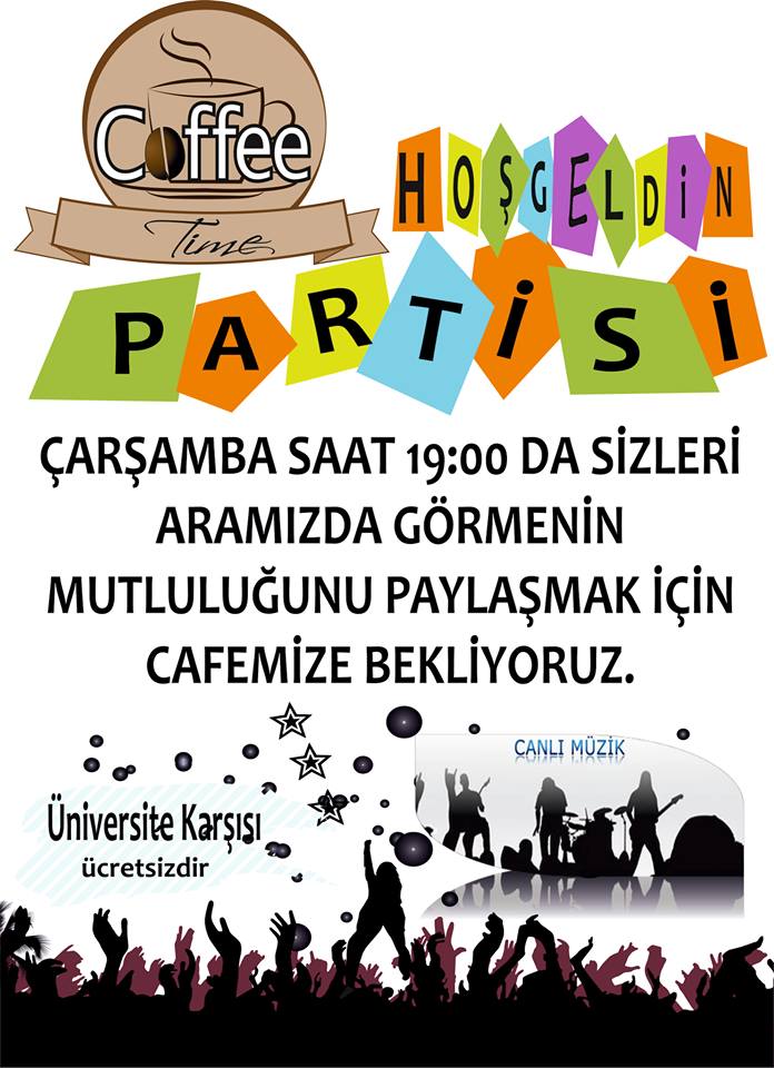 Coffee Time Hoşgeldin Partisi, 09.10.2013 Çarşamba günü 19:00-23:00 saatleri arasında, Sakarya Üniversitesi Hendek Kampüsü karşısında, üstelik ücretsiz.